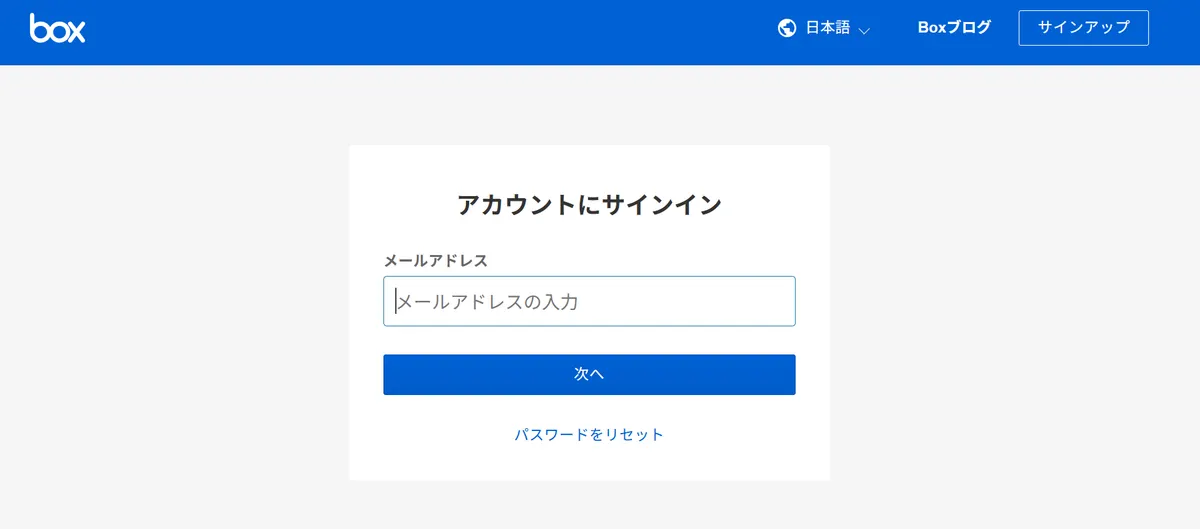 資料フォルダメニュー(Box)へアクセスいただくと、ログイン情報の入力画面が表示される。