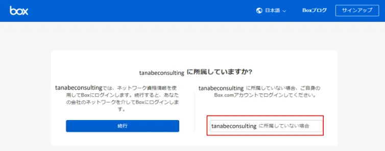下記が表示された場合は、【 tanabeconsultingに所属していない場合 】(画像赤枠箇所)を選択ください。